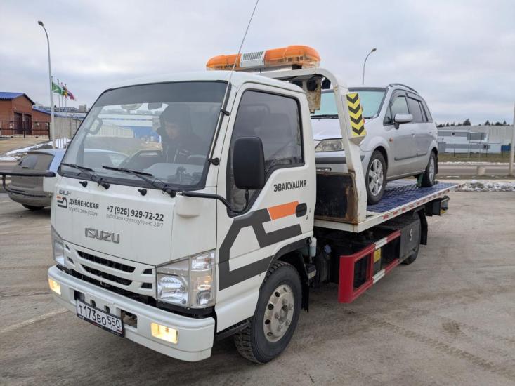 Эвакуатор Isuzu ELF в г. Дубна со сдвижной платформой, лебедкой и частичной погрузкой