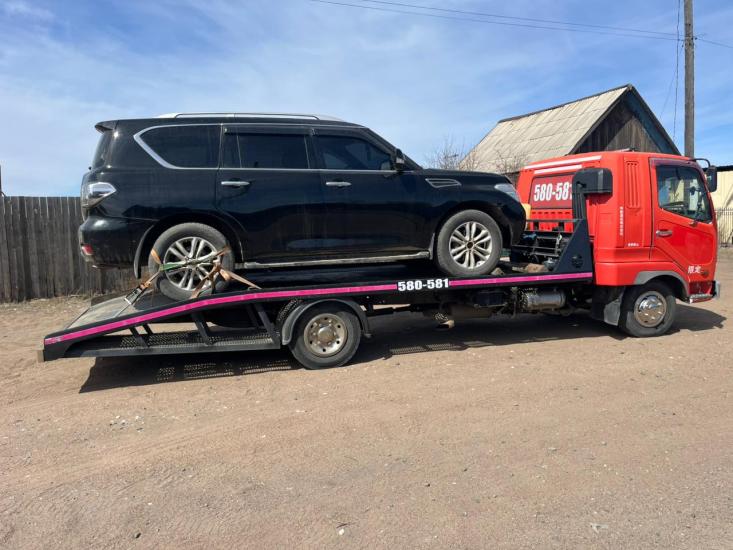 Эвакуатор Mitsubishi Fuso в г. Улан-Удэ с ломаной платформой, лебедкой и подкатными.